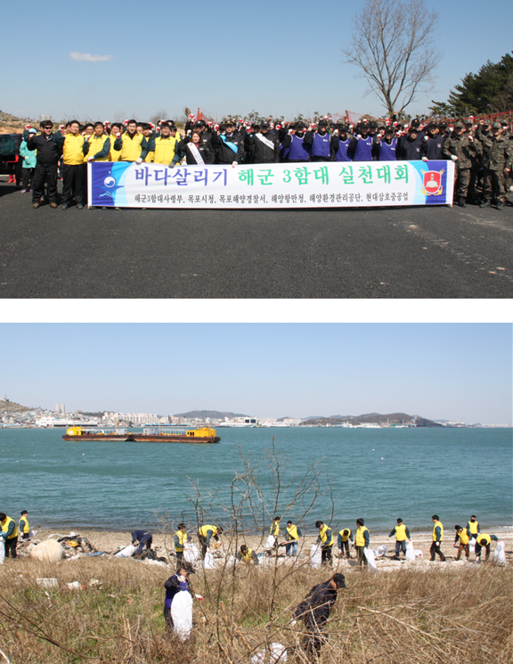 이날 행사는 전남일보 2014 「바다를 살리자」 연중기획 프로그램에 참여한 해군 3함대 사령부를 주축으로 우리회사, 목포시청, 목포해양경찰서, 해양항만청, 해양환경관리공단 등 6개 민,관,군 약 250여명이 합동으로 참석한 가운데 진행되었습니다.